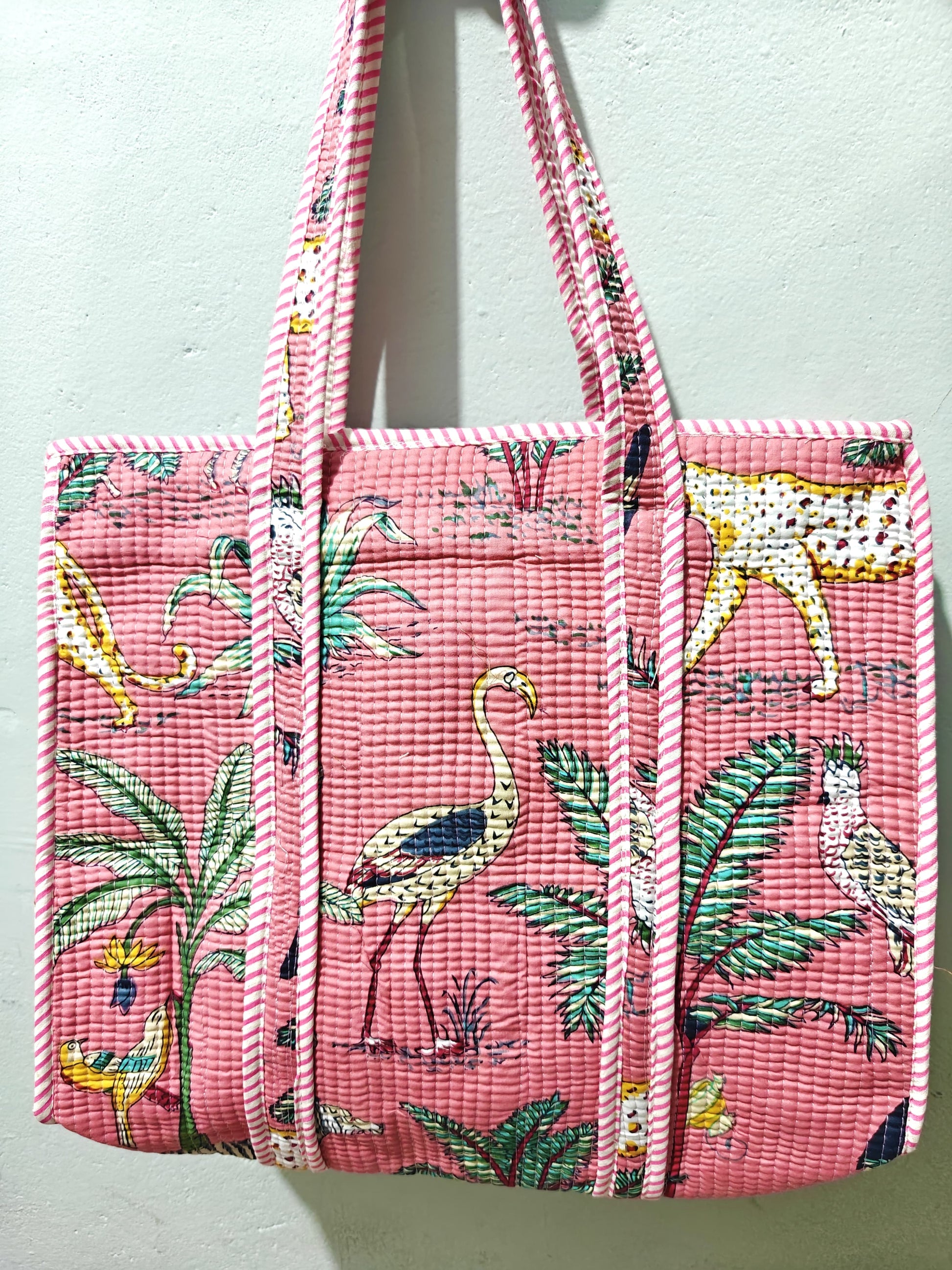 Cotton Quilted Tote Bag with Zip & External Water Bottle Pocket